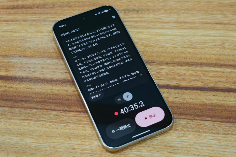 出勤後は会議……という体で、オンデバイスでの文字起こしが可能なレコーダーアプリを使用する。以前の Google Pixel シリーズでも利用できるアプリだけれど、文字起こしは相変わらずの高精度だ。新しいTensor G5のおかげか、以前の機種と比べても一段とレスポンス良くスムーズに文字起こしされる印象がある。常時画面オンのまま40分ほど動かして、バッテリー残量は86%となった。