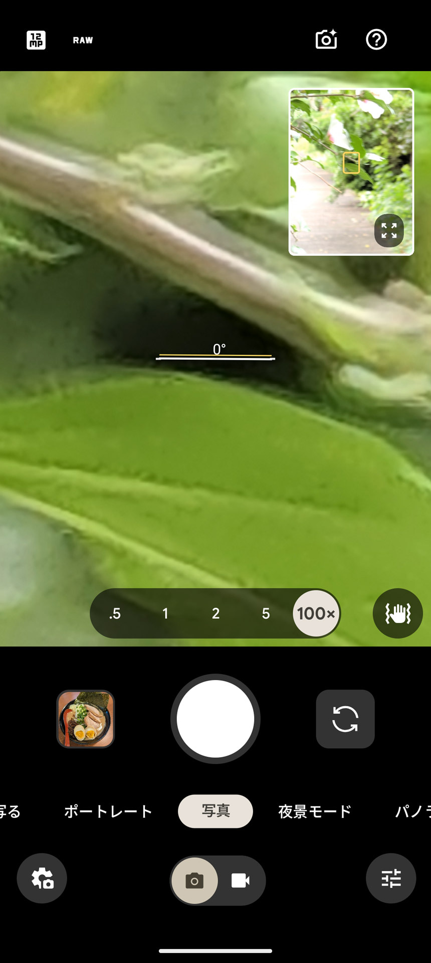 光学ズームは10倍までで、それ以上はデジタルズームになる。だけれど、デジタルズームで撮影した場合にはAIを活用して画像の細部を補完する「超解像ズーム Pro」機能が働く。撮影後すぐに超解像処理が始まり、数秒待てばくっきりとした高精細な写真に補正される。これまでのデジタルズーム画像にあったノイズや粗さは一切なく、しかもAI補正だからといって不自然に見える箇所もない。かなり実用性の高い100倍ズームだ。