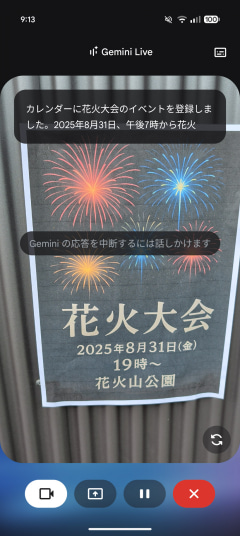 Gemini LiveはGoogle カレンダーやGmailなど、Googleサービスとの連携も進んでいる。イベントのチラシやポスターを写しながら「カレンダーに登録して」とお願いすれば、記載されているイベント名や日時を抽出してGoogle カレンダーに自動登録してくれるし、「最近受け取った重要なメールを教えて」と依頼すれば、Gmailの受信メールから該当するものを探し出して音声で伝えてくれる。