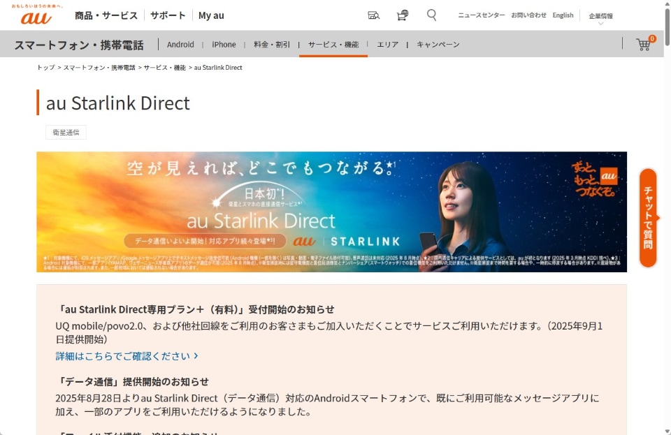 (※2)対象エリア:日本国内のau5G/4GLTEエリア外 音声通話は未対応(2025年8月時点)