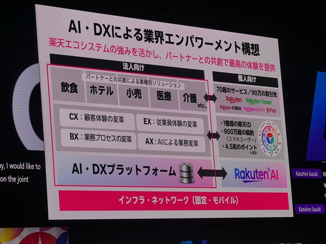 イベント2日目には、楽天モバイルの共同CEO 鈴木和洋氏が 「すべての企業にAI×DXを ~共創で広がる業界エンパワーメントの未来」 と題して講演。楽天モバイルの法人事業を紹介するとともに、パートナー企業のAI・DXの取り組みを紹介した。ここでは講演の内容と、それに関連するエキシビションの展示を紹介しよう。