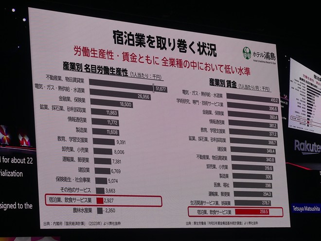 他方、宿泊業を取り巻く状況は厳しい。産業別の名目労働生産性は下から2つ目。産業別賃金は最も低い。人手不足と高齢化も進んでいる。浦島観光ホテルの従業員も平均年齢は48歳。60代以上も多いという。