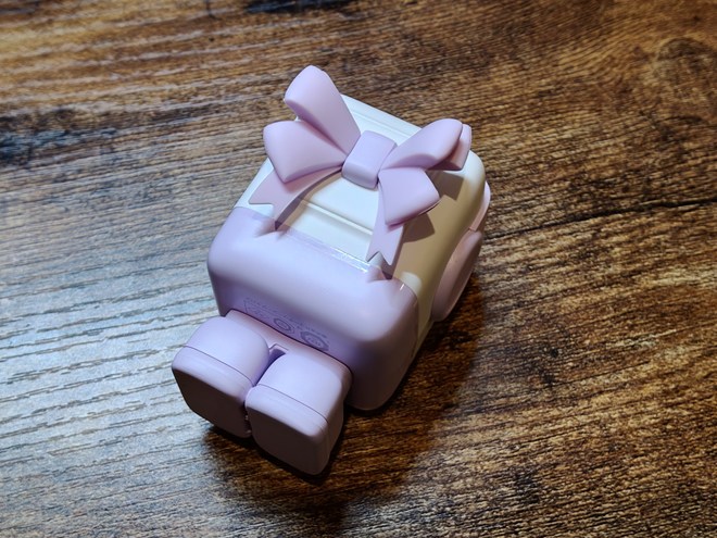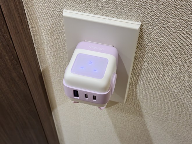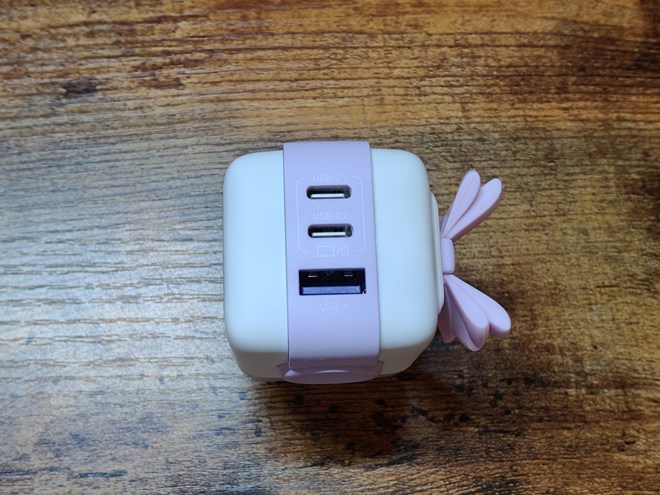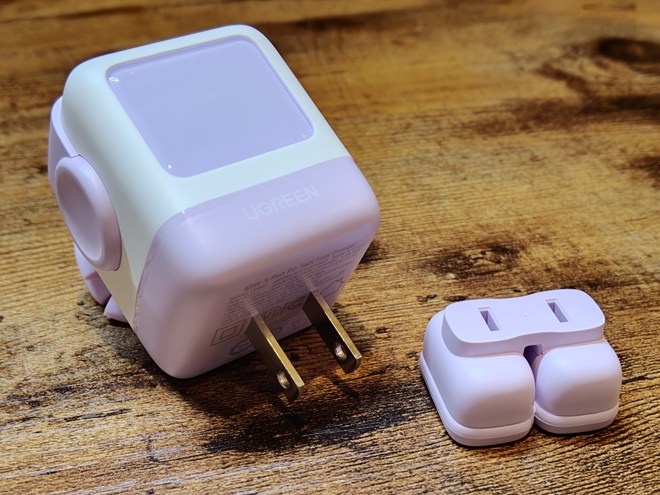 まずはUGREENの代名詞でもある急速充電器。筆者が手にした福袋には「UGREEN Uno 急速充電器 65W」が入っていました。充電器ではあまり見かけない、リボンのついた可愛らしいデザインで、UGREEN的には「ゆめいろ」というカラーらしいです。足の部分がカバーになっており、取り外してコンセントに差し込むことができます。