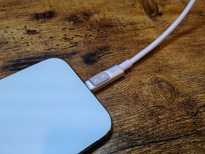 端子部分の少し下にはLEDディスプレイが付いており、充電中は笑顔の顔文字が現れます。使用中のワット数やデータの伝送速度が出るわけではないのですが、こちらも可愛さ重視ということで。