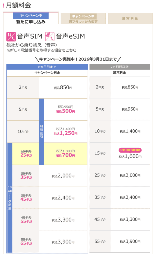 - 「20ギガプラン」月額2000円→【改定後】25ギガに
