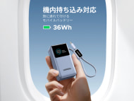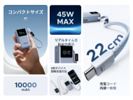 バッテリー容量1万mAhで、最大45WのUSB PD出力に対応したモバイルバッテリー。本体のUSB-Cポート、USB-Aポートに加え、内蔵のストラップ型USB-Cケーブルを利用し、最大3台のデバイスを同時に充電できる。一部のノートパソコンへの給電が可能なほか、GalaxyシリーズのPPSやXiaomi/Redmi独自の急速充電規格にも対応する。