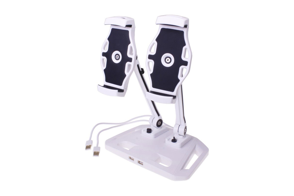 スマホとタブレットをしっかり設置できるデュアルアームスタンド、上海問屋