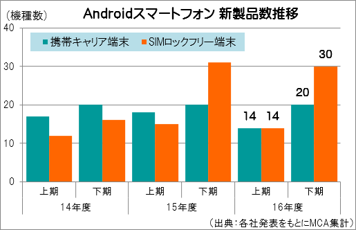 2016年度のスマホ新機種数、SIMフリー端末がキャリア端末を大きく上回る