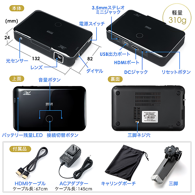 バッテリー内蔵のモバイルプロジェクター、サンワサプライから