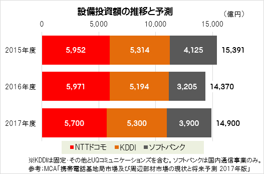 モバイルキャリア3社の設備投資額、2017年度は530億円増を見込む