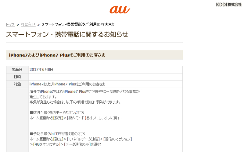 au、海外でiPhone 7/7 Plusの利用中に圏外になる事象