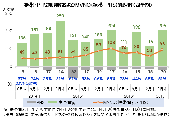 携帯・PHS純増数に占めるMVNOの割合は約半数
