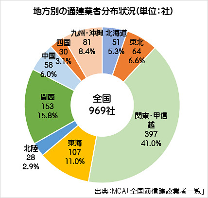 国内通信建設業者の約4割が関東・甲信越地方に集中