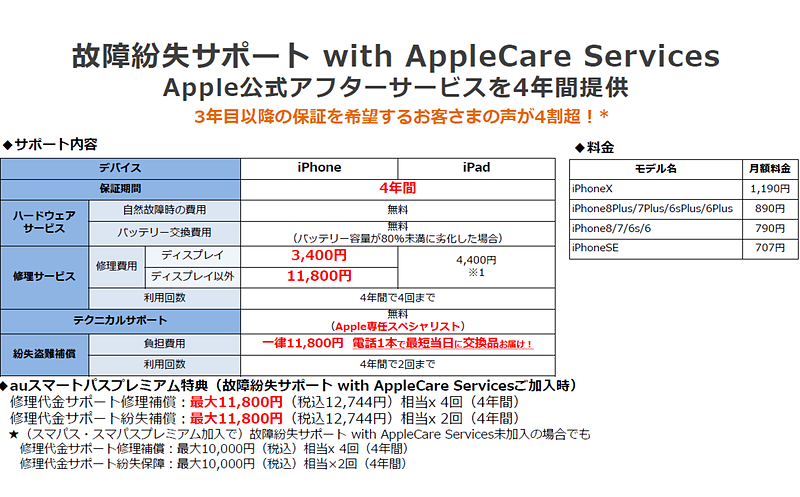 au、iPhoneの故障・紛失を4年間保証「AppleCare+ & au端末サポート」