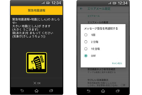 緊急地震速報でイラストも表示、ドコモの「エリアメール」アプリ