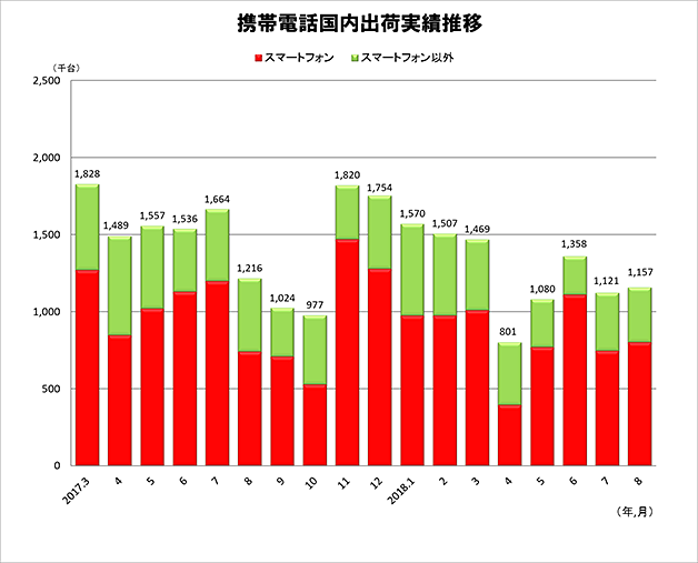 8月の国内メーカー携帯出荷数、スマホは前年超えに