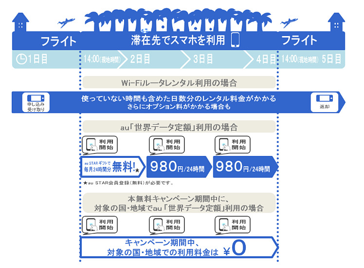 auの「世界データ定額」7月22日開始、1日980円でデータ容量は日本と共用【更新】