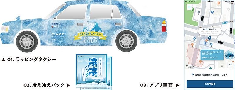冷涼グッズが用意された無料のタクシーが大阪で運行、「MOV」で配車