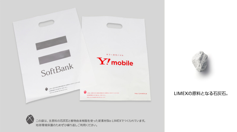 ソフトバンク、手提げ袋に石灰石と植物由来樹脂を使用した新素材の「Bio LIMEX Bag」を導入