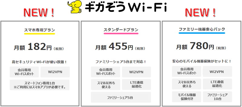• 公衆Wi-Fi「ギガぞう」に月額200円で利用できる新プラン、デバイス補償付きのプランも