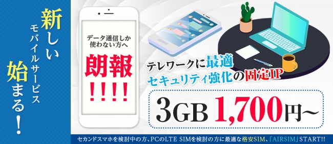 AIRSIMモバイル、テレワーク向けの固定IP付きSIM