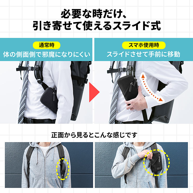 サンワサプライ、リュックやショルダーベルトに取付可能なスライド式スマホポーチ