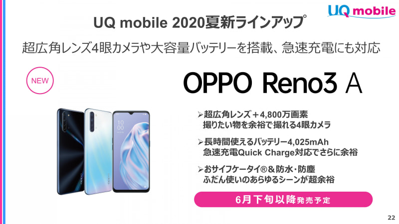 • UQ、4眼カメラの「OPPO Reno3 A」を6月25日発売