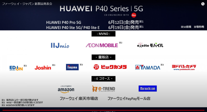 • ファーウェイP40シリーズはMVNO「IIJmio」「イオンモバイル」「exciteモバイル」で発売、量販店やオンライン通販でも