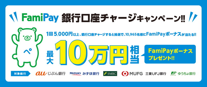 ファミペイ、抽選で最大10万円相当のFamiPayボーナスが当たる「銀行口座チャージキャンペーン」