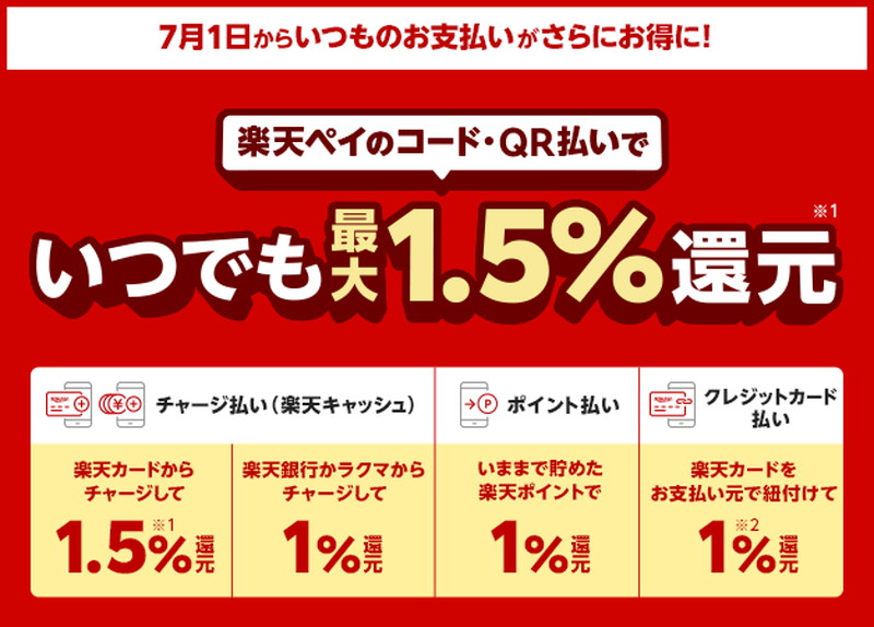 楽天ペイ、「楽天キャッシュ」によるQR/コード決済で常時1.5%還元に