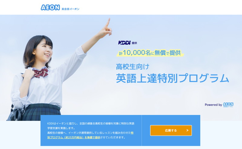 KDDI、「高校生向け英語上達特別プログラム」を1万人に無償提供、イーオンの英会話レッスンが4カ月間無料