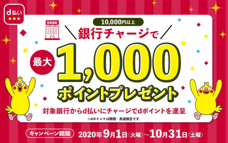 「d払い」、銀行口座からのチャージで最大1000ポイントプレゼント