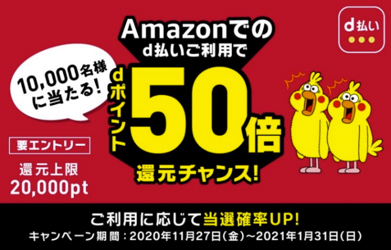 d払い、Amazonで1万円以上利用すると抽選で1万人に2021ポイントのお年玉特典
