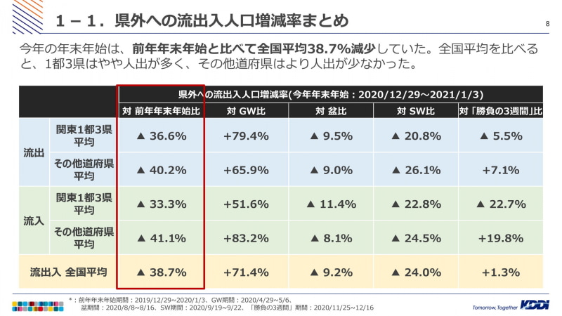 KDDI、年末年始の人流分析結果を公表、全国的に移動自粛傾向(2/24)