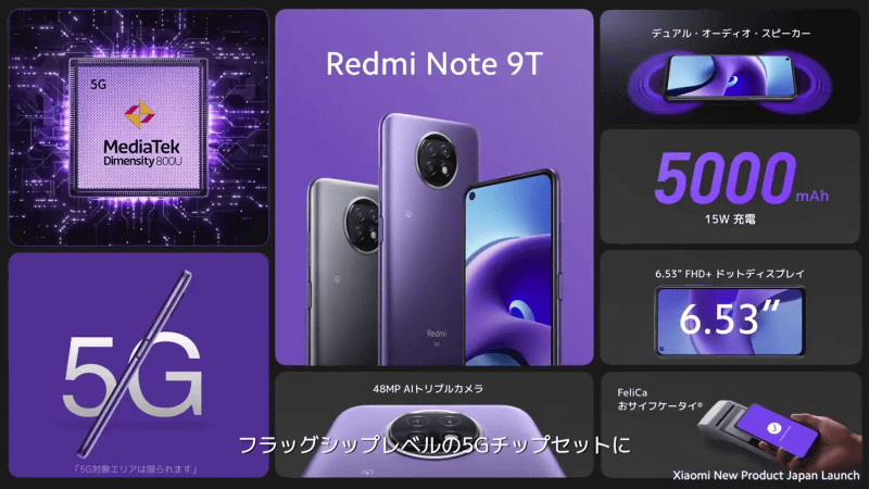 ソフトバンク、シャオミ製の5G/おサイフ対応スマホ「Redmi Note 9T」26日発売、新規1円も