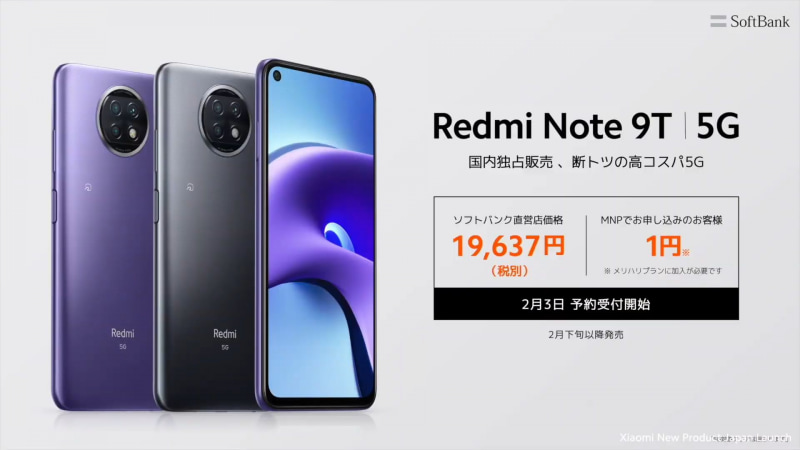 • シャオミの5Gスマホ「Redmi Note 9T」発売、2万円でソフトバンク独占販売