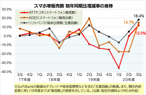 20年10~12月期の端末販売、3キャリア揃って前年同期比10%強の増加を記録