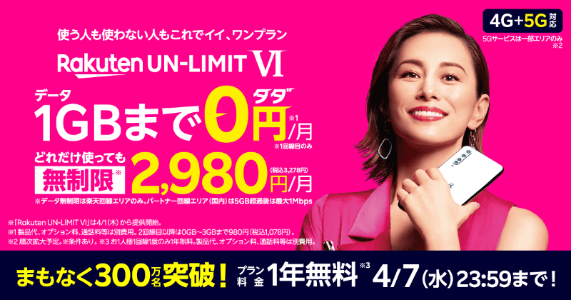 楽天モバイル、4月7日で「1年無料」の受付終了