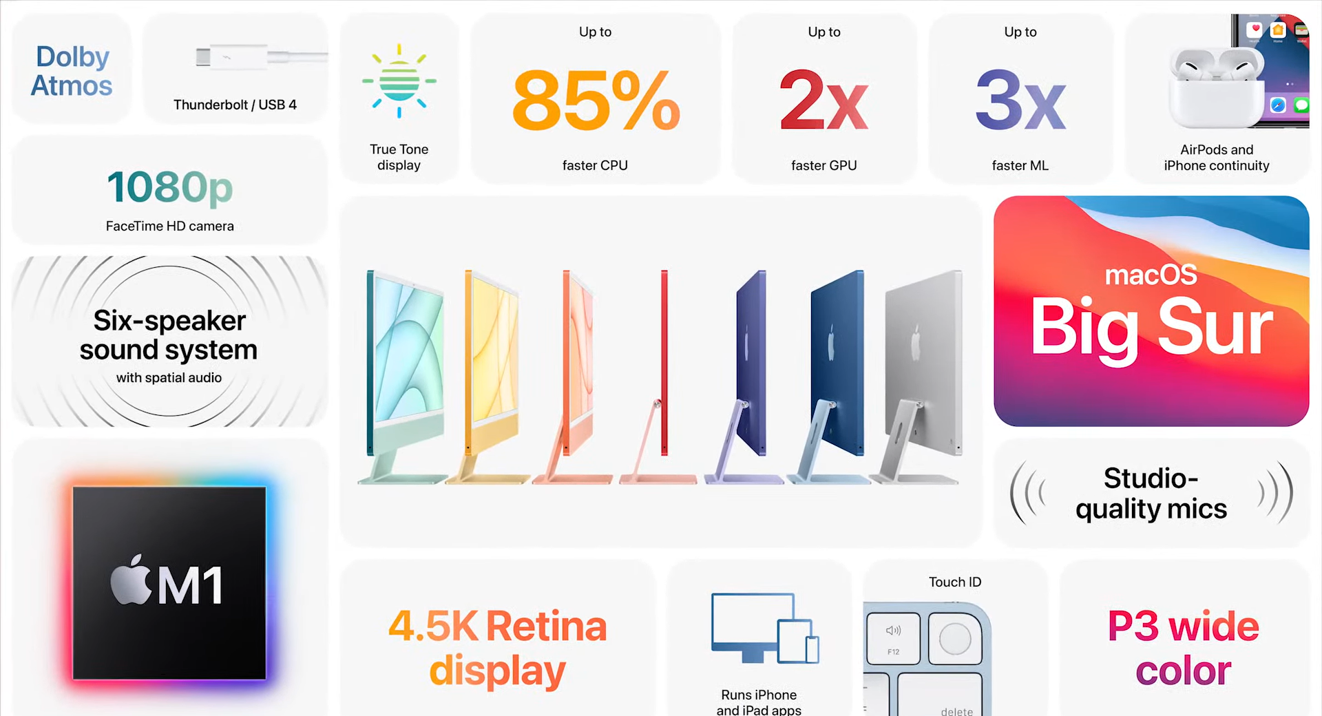 • アップルから新型「iMac」登場、7色展開でiPhoneアプリも動く「M1」チップ搭載
