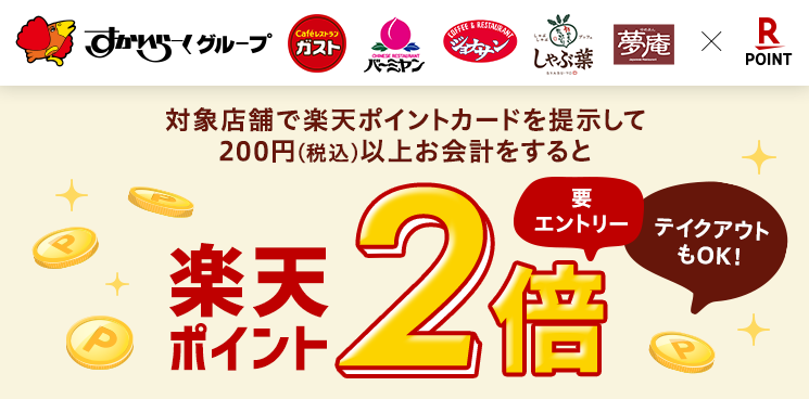 楽天ポイントが2倍になる、「ガスト」「バーミヤン」などすかいらーくとコラボキャンペーン