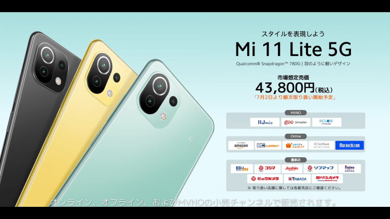 シャオミ5Gスマホ「Mi 11 Lite 5G」7月2日発売、FeliCa搭載で4万3800円