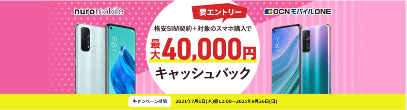 対象のスマートフォンと指定の格安SIM契約で最大4万円キャッシュバック