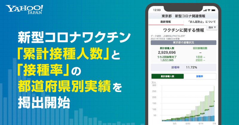「Yahoo! JAPAN」に都道府県別の新型コロナワクチン接種人数を掲載、アプリ版とブラウザ版で