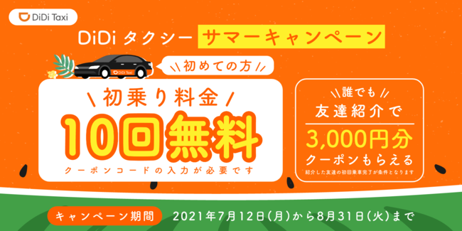 「DiDiタクシーサマーキャンペーン」、初乗り10回無料に
