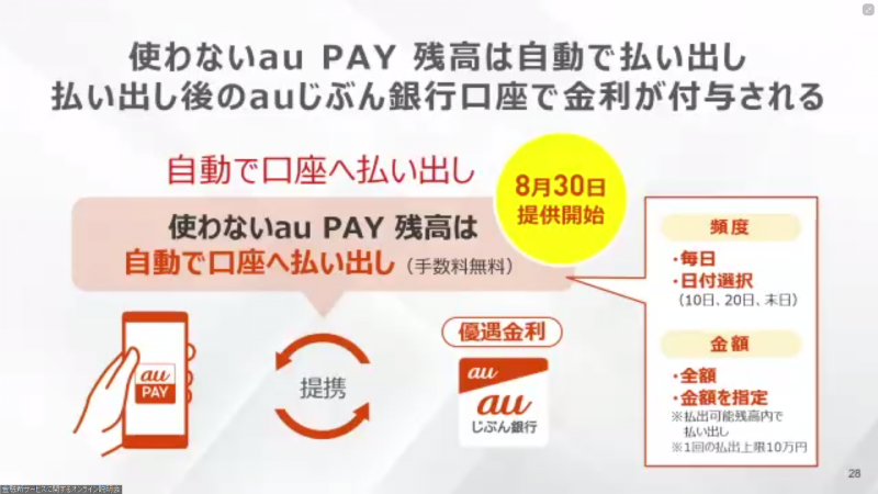 • 「au PAY残高→auじぶん銀行」の自動払出を提供、30日から