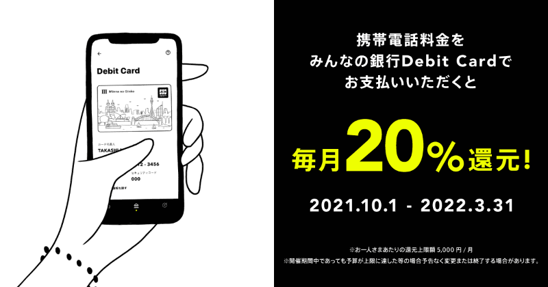 みんなの銀行Debit Cardで、毎月の携帯電話料金が20%還元されるキャンペーン