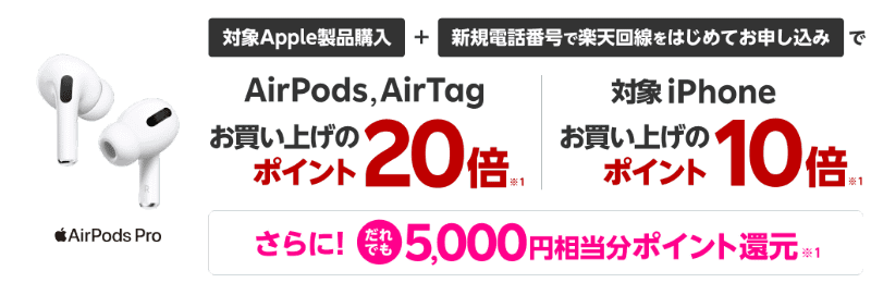 楽天モバイル、iPhoneやAirPods購入で最大20倍の買い物ポイント+5000ポイント