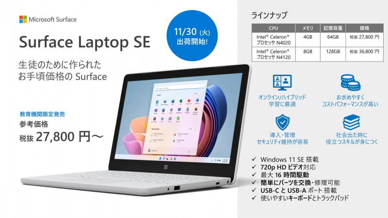 教育向け「Surface Laptop SE」は30日提供開始、ソフトとハードの両面でマイクロソフトが挑む教育ICT