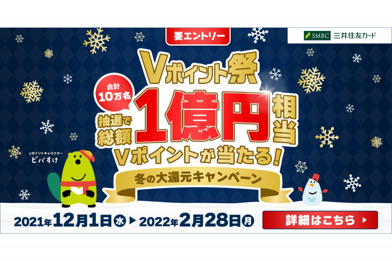 三井住友カード、抽選で1万人に2022円分のVポイント還元キャンペーン