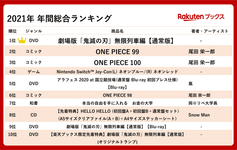 楽天、「2021年 エンタメ年間ランキング」を発表(2/6)